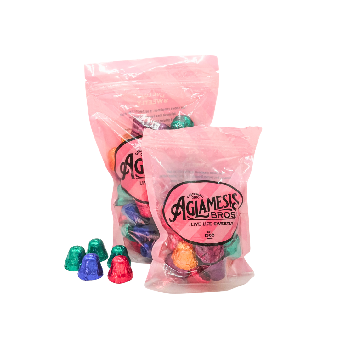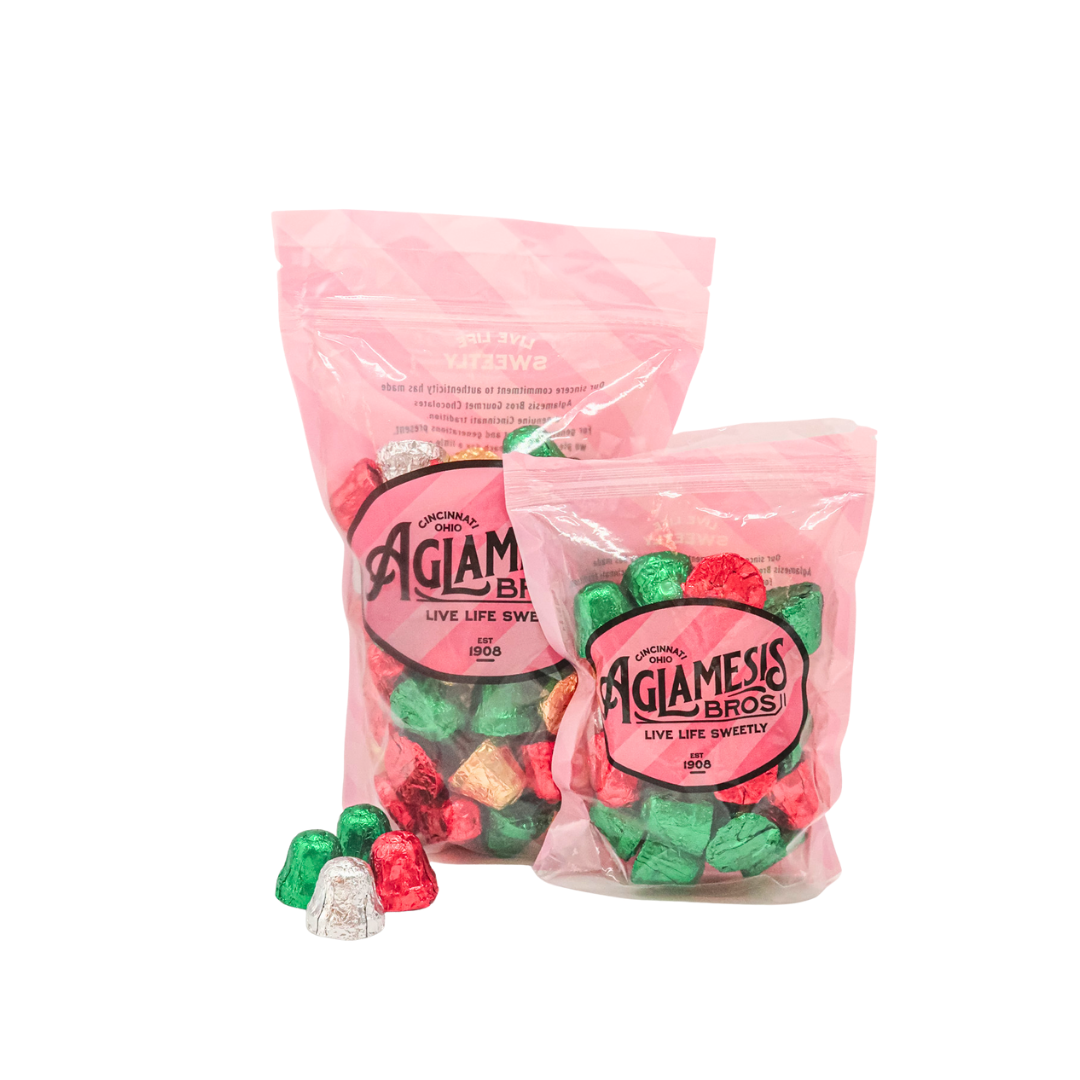 Brilliantly wrapped solid chocolate Christmas Bells packaged an a signature Aglamesis 8oz or 16oz bag. Available in milk or dark chocolate.